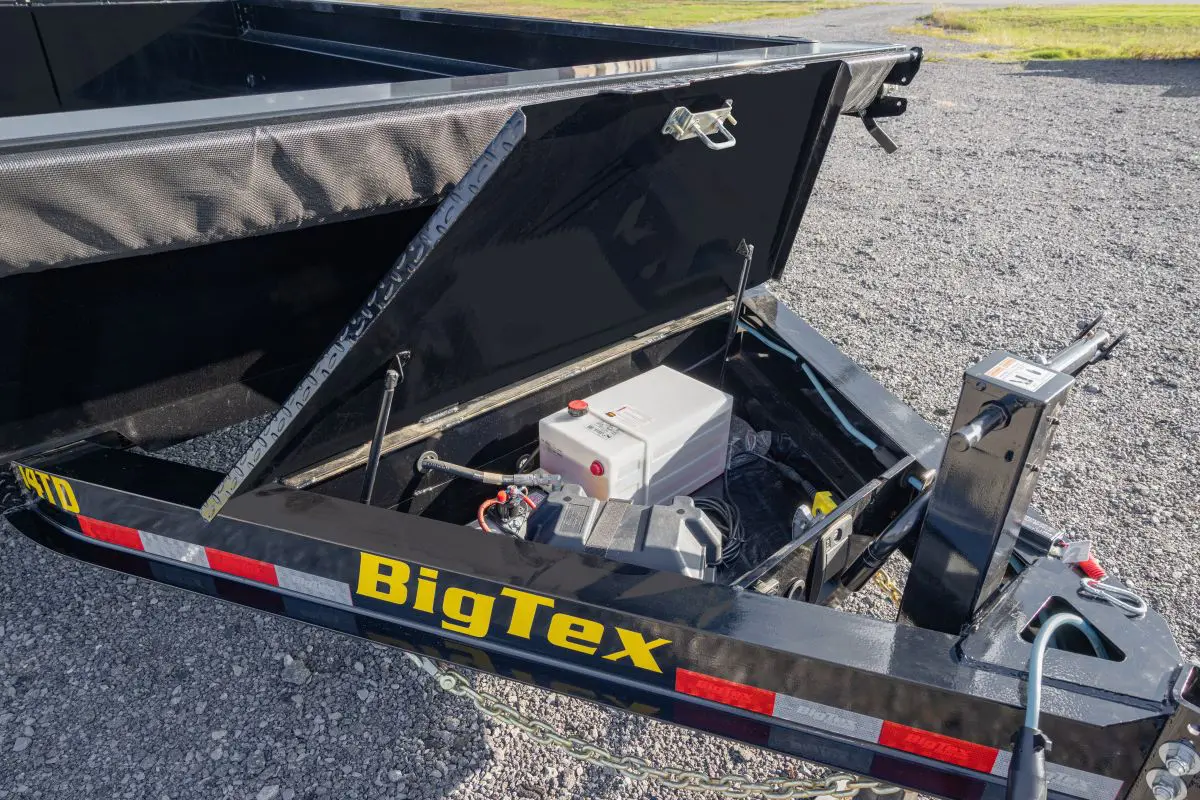 The redesigned 16TD from Big Tex is engineered for serious work. Featuring a 5-Stage Front-Mount Telescopic Cylinder, it delivers smooth, reliable lifting power for even the heaviest loads. The front-mounted cylinder enhances service access, while a steep 45° dump angle ensures fast, efficient unloading. The advanced dump body design includes reinforced side rails for added strength, and convenient features like the Demco EZ-Latch and full-width toolbox come standard. With available 4' sides, the 16TD can haul up to 16.3 cubic yards—built tough for long-lasting performance.